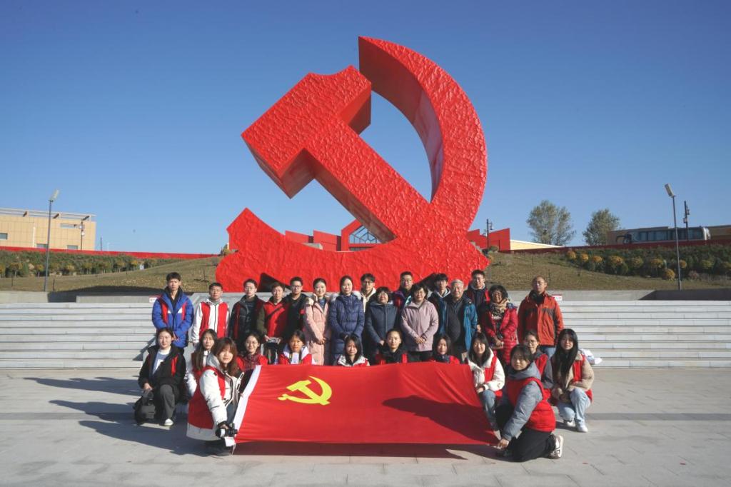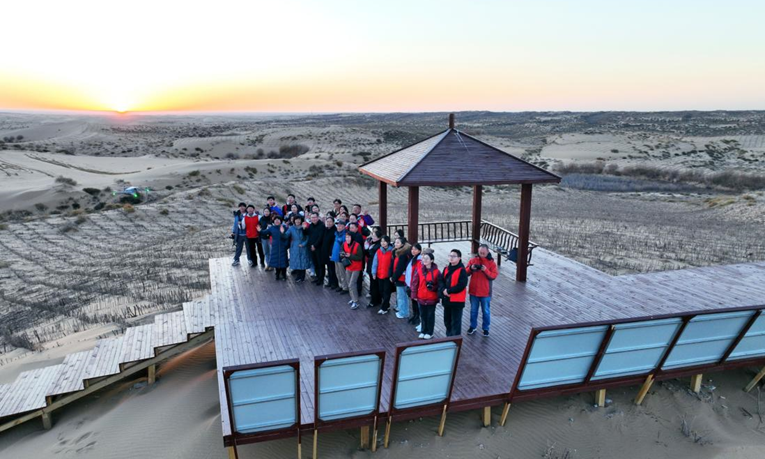 脚下有泥土,笔下才能有文章。初冬的乌审大地,天空湛蓝深邃,大地苍茫悠远。11月10日至12日,yl23455永利集团党委书记张丽萍教授、新闻系教师刘寒娥、邢渊渊、马骐、刘研、王潇雨带领22名新闻系本科生、硕士生赶赴鄂尔多斯乌审旗,探寻人类文明遗迹,追寻红色文化印记,感受绿色生态成就,引导学生在行走的新闻实践中深刻体悟中国式现代化的伟大成就。同学们俯下身、沉下心、察实情、动真情,在行与思中践行“四力”,用心感知乌审旗“传红兴绿”的生动故事。