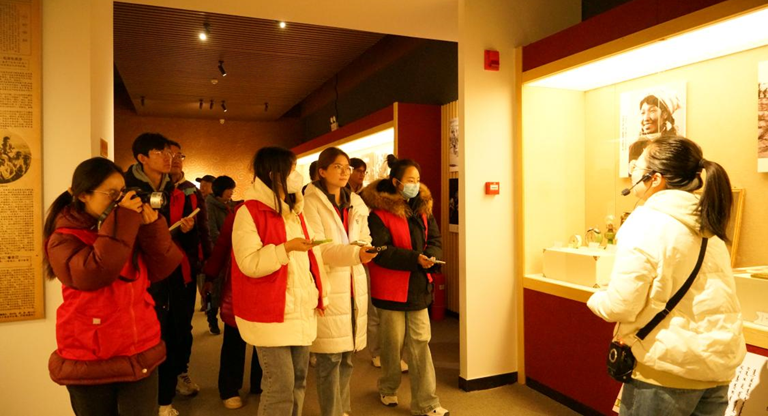 乌审旗是全区最早的革命根据地和解放区之一,也是中共中央进入陕北后开展内蒙古革命斗争的切入点。在乌审旗革命故事讲习馆,同学们通过触碰地图上的红色点位参与互动,当年的行军路线以及发生过的历史事件慢慢浮现在眼前;在中共乌审旗委办公旧址,师生们走入廊道高度不足1.7米的窑洞,脚板踩着黄土地,头顶顶着黄土屋,阅读泛黄的文献,身临其境地感受当年中共乌审旗委干部们的艰苦生活环境。展柜里陈列着的文物见证了那段烽火连天的峥嵘岁月,也将英勇无畏的革命精神传递给今天的我们。