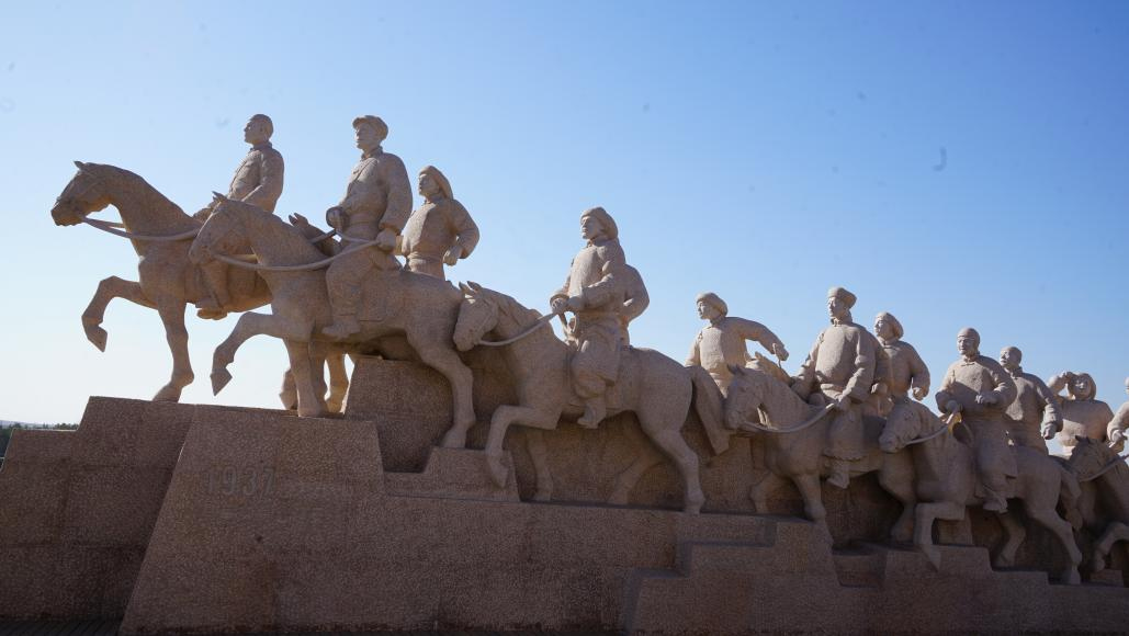 在星火广场,同学们观赏了乌审旗人骑着马匹赶往延安的雕像,百年前蒙古族进步青年奔赴延安学习的画面随即映入眼帘。抗日战争时期,数百位蒙古族青年来到延安,学习历史、军事、马列主义和民族观。一批批青年将延安的革命思想、民族理论带回了草原,把实现草原的解放与中华民族的解放紧紧结合在一起,将思想和理论的力量转化为解决民族问题的实践指引。