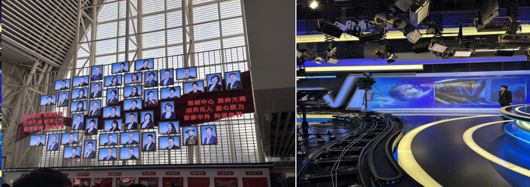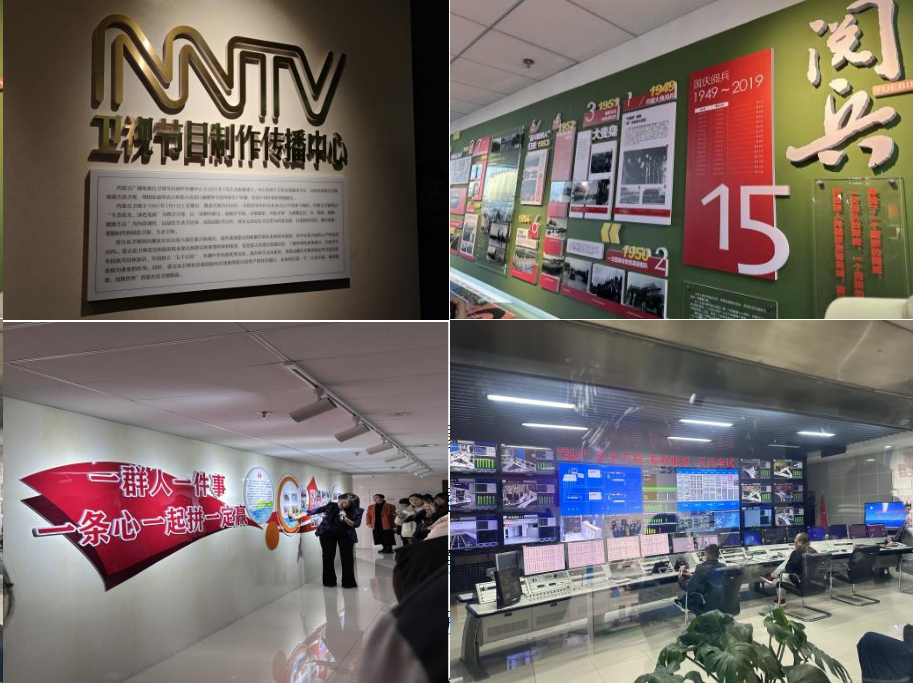 接着,工作人员为大家介绍了内蒙古广播电视台一楼西侧文化走廊以及300平开放式高清新闻演播室,切身实地感受媒体人的工作环境和氛围。文化墙上挂着广播电视台出色媒体人的照片,讲解员详细介绍了这些优秀前辈的成就,引发现场连连赞叹。这份榜样的力量将激励着同学们不断奋进,成为更加优秀的新闻人。在演播室,同学们踊跃参与,纷纷站在镜头前体验新闻主持人的直播工作。