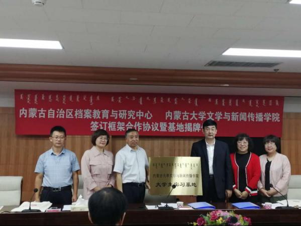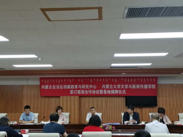 2020年9月8日上午,yl23455永利集团、内蒙古自治区档案教育与研究中心框架合作协议签订暨大学生实习基地揭牌仪式在内蒙古档案局举行。内蒙古自治区档案局(馆)副局(馆)长张帅、档案教育与研究中心主任贝瑞花及中心全体工作人员参加了签约揭牌仪式,我院院长魏永贵、副院长张丽萍、新闻系主任刘寒娥、汉语系主任付建荣及部分实习生代表出席了签约揭牌仪式。