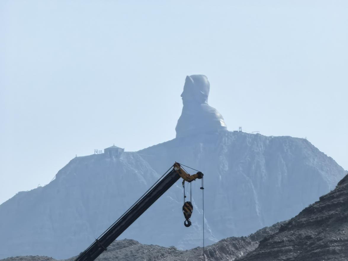 从交通洞向上水库驶出,视野越发变得开阔,山路也越发崎岖起来。沿Y2 公路向上盘旋行进,远处的成吉思汗铜像在阳光下熠熠生辉。几经颠簸后,上水库库盆映入眼帘,有数几十辆卡车、钻机等交叉作业,它们各司其职,相互配合,共同完成上水库库盆和进出水口开挖、大坝填筑、引水事故闸门井开挖、引水上斜井等作业。
